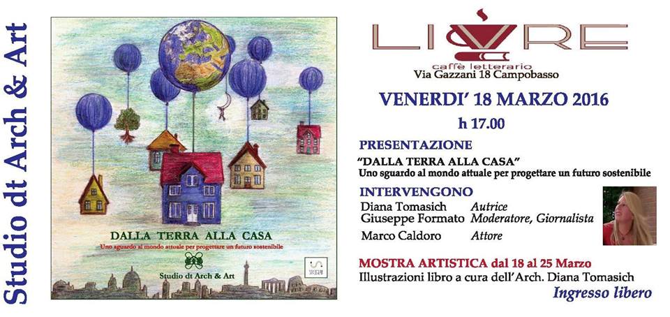 Si informano gli iscritti che il giorno Venerdì 18 Marzo 2016, al caffè letterario Livre in via Gazzani 18, si terrà la presentazione del libro “Dalla Terra alla Casa – Uno sguardo al mondo attuale per progettare un futuro sostenibile“, nella quale interverranno l’autrice, arch. Diana Tomasich, e l’attore Marco Caldoro. L’evento inaugurerà anche la mostra artistica dal 18 al 25 Marzo con le illustrazioni presenti nel libro.