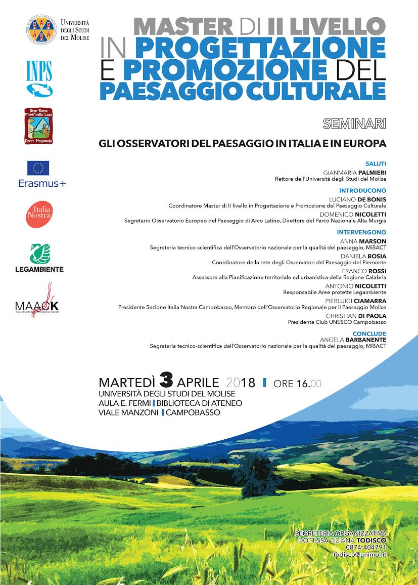 L’Università degli Studi del Molise nell’ambito del Master Universitario di II livello in “Progettazione e promozione del paesaggio culturale” ha organizzato il seminario dal titolo ” Gli Osservatori del paesaggio in Italia e in Europa” che si terrà martedì 3 aprile alle ore 16,00 a Campobasso presso la Biblioteca di Ateneo – Aula E.Fermi.Allegato locandina