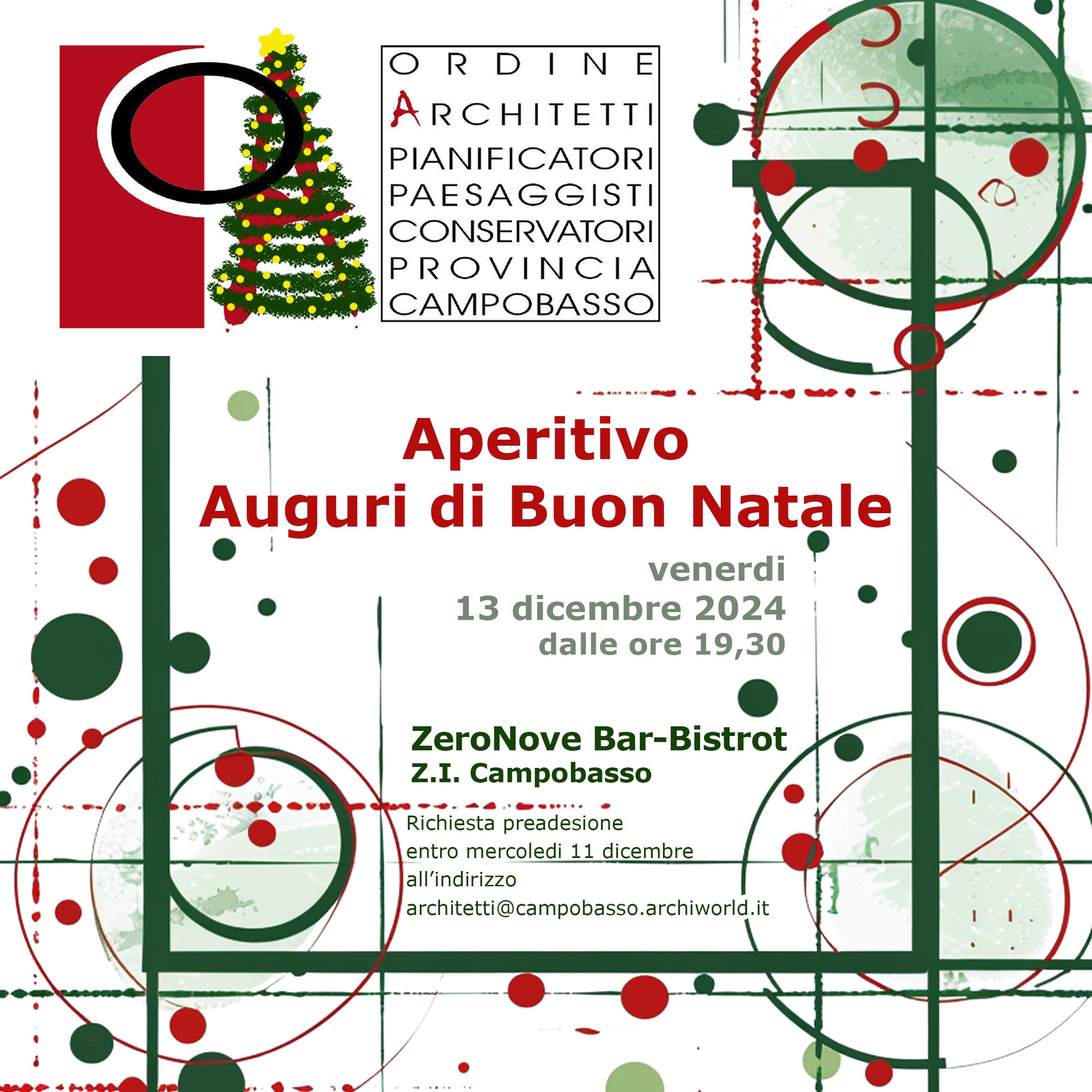 Per partecipare all’aperitivo è richiesta la pre-adesione entro mercoledì 11 dicembre, inviando una mail a architetti@campobasso.archiworld.it.