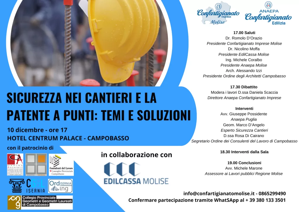 Confartigianato con il patrocinio di codesto Ordine degli Architetti della Provincia di Campobasso, organizza il seminario “SICUREZZA NEI CANTIERI E LA PATENTE A PUNTI: TEMI E SOLUZIONI” in programma per il giorno 10 dicembre 2024 dalle ore 17:00 presso l’Hotel Centrum Palace di Campobasso.