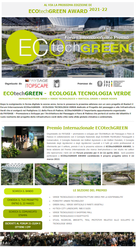 La nuova edizione del Forum Internazionale ECOtechGREEN, organizzato da PAYSAGE e promosso dal CNAPPC, avrà luogo al Nuovo Centro Congressi della Fiera di Padova il prossimo 21-22 aprile 2022.